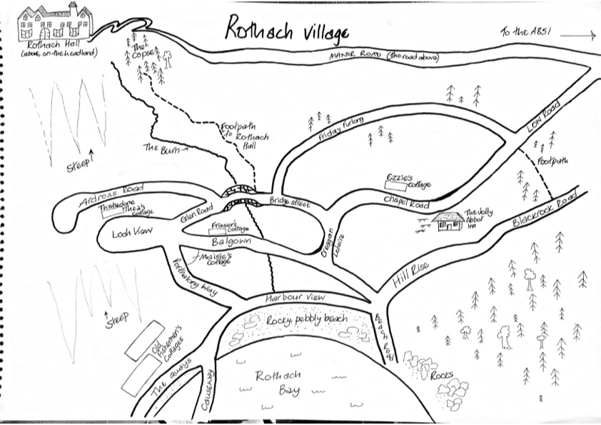 Like any village, Rothach has its quirks. Thea lives in Loch View, though there is no loch to have a view of as the sea there is actually a sound (i.e. open at both ends, not just one). Chapel Road has no chapel, but the pub’s called the Jolly Abbot, so perhaps there was one there once. And maybe the abbot brewed beer, and that’s what made him so jolly?
